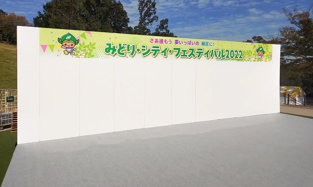 ステージはいつもの場所に、いつもと違う景色を届けることでイベントならではの非日常感をお届けする発信装置のような役割を持っています。これにバックパネルが加わることで、より立体的で遠目からでも目立つようになりました。
