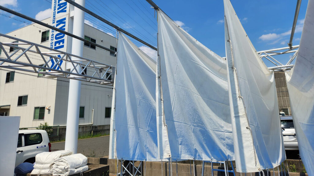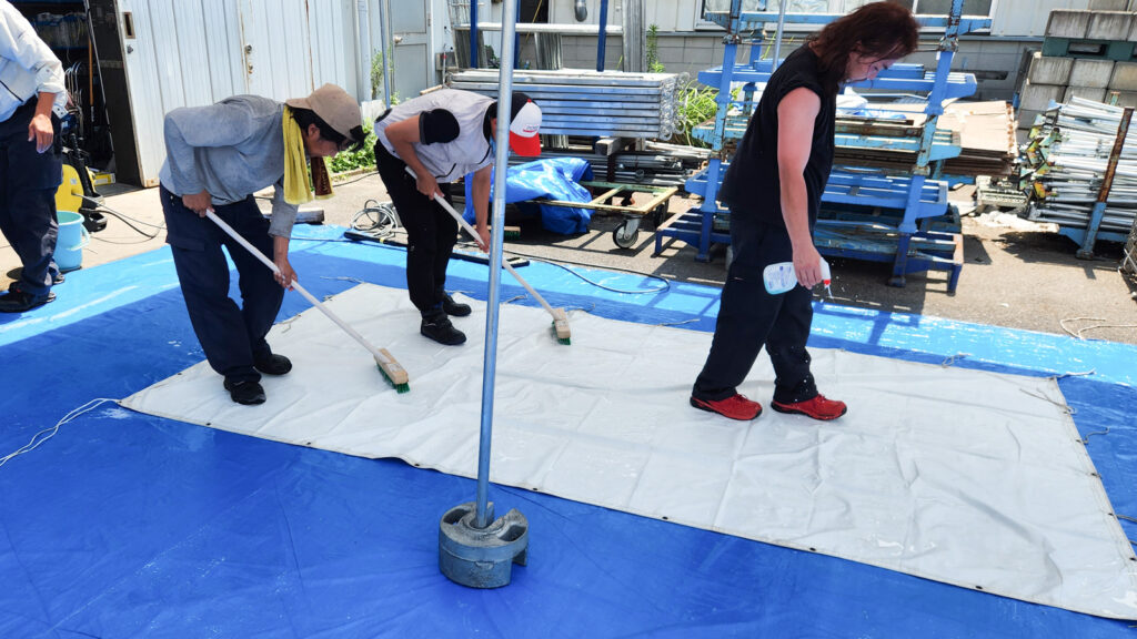 天幕クリーニングの様子です。お客様に心地よくテントをご利用いただく為に、チームでテントを清掃しています。