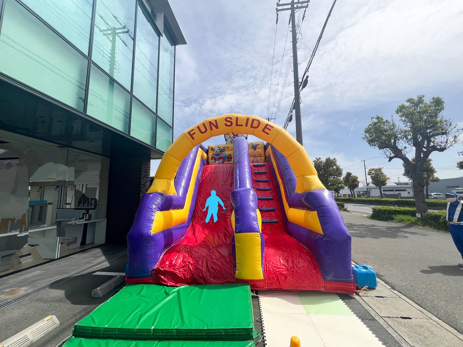 電源を引っ張り、ブロアーで全体を持ち上げています。(ふわふわ遊具によって送風口の数は変化します)