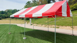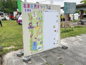 メインのステージ、パイプテントや片流れテント、ステージなどの部材を搬入して組み立てを行いました。会場内にいらっしゃったお客様が迷わないようにまた案内看板も設置しました!