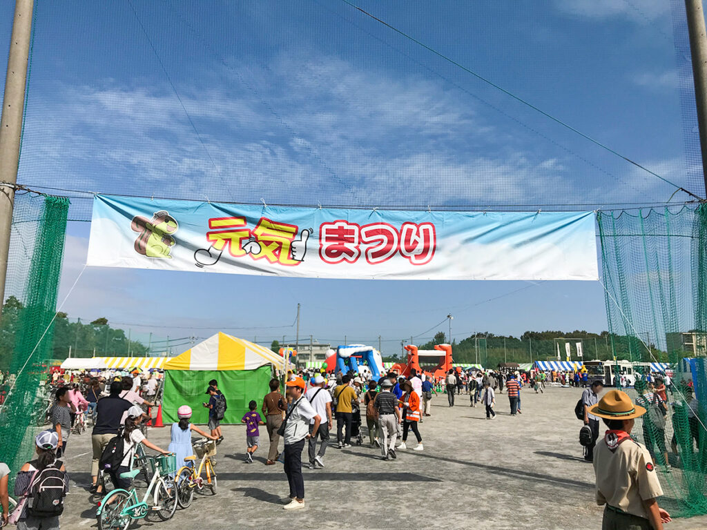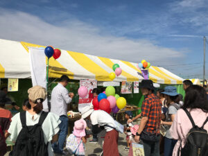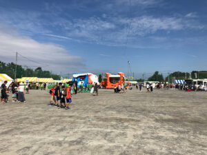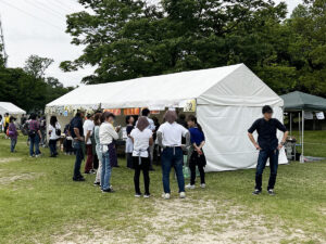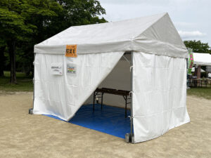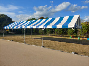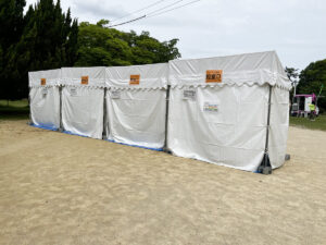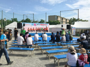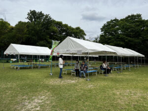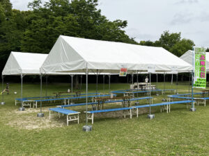 ステージや観覧席に使うベンチはもちろん、横断幕(ターポリン幕)にトラスゲートなども設置しています。テントは色とりどりのものからオーソドックスな白いパイプテントなど様々なものを設置してきました。当日は大勢の方が集まって、にぎやかなイベントとなりました!