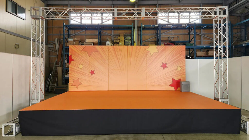 ステージバックにオリジナルのバックパネルがあり、臨場感がUPします!スポンサーボードとしても背景パネルとしても大活躍します。パネルの出力や木工場は自社出力。コストパフォーマンスも抜群です!