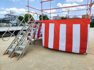 南区にある小学校のグラウンドにて、盆踊り用の櫓を施工した時の様子です。支柱は紅白のテープでグルグル巻きにし、提灯を下げてお祭りの雰囲気が出ました!