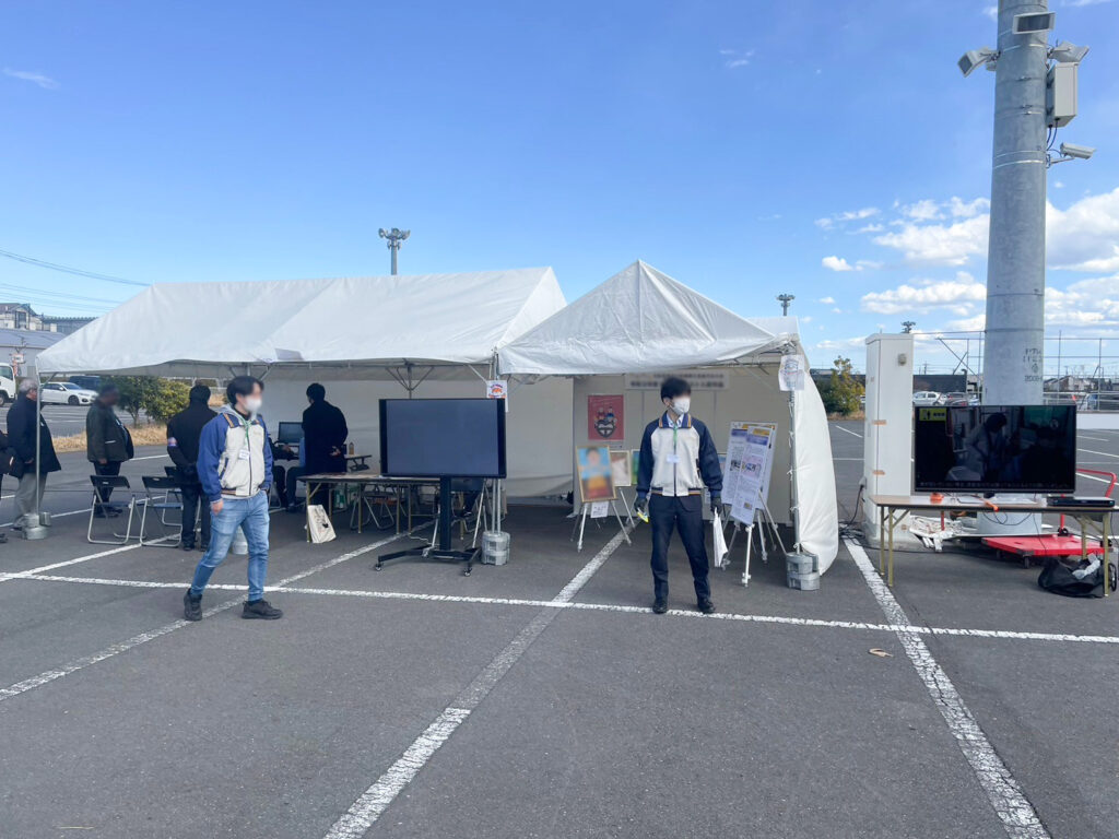 消防署の出初め式で弊社のアイテムをご利用いただきました。テントの周辺には紅白幕を取り付け、入り口付近には看板なども設置しました。当日は晴天で、複数の消防車が噴射している様子は、迫力がありました!