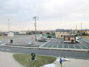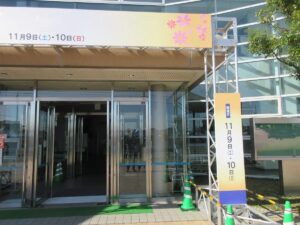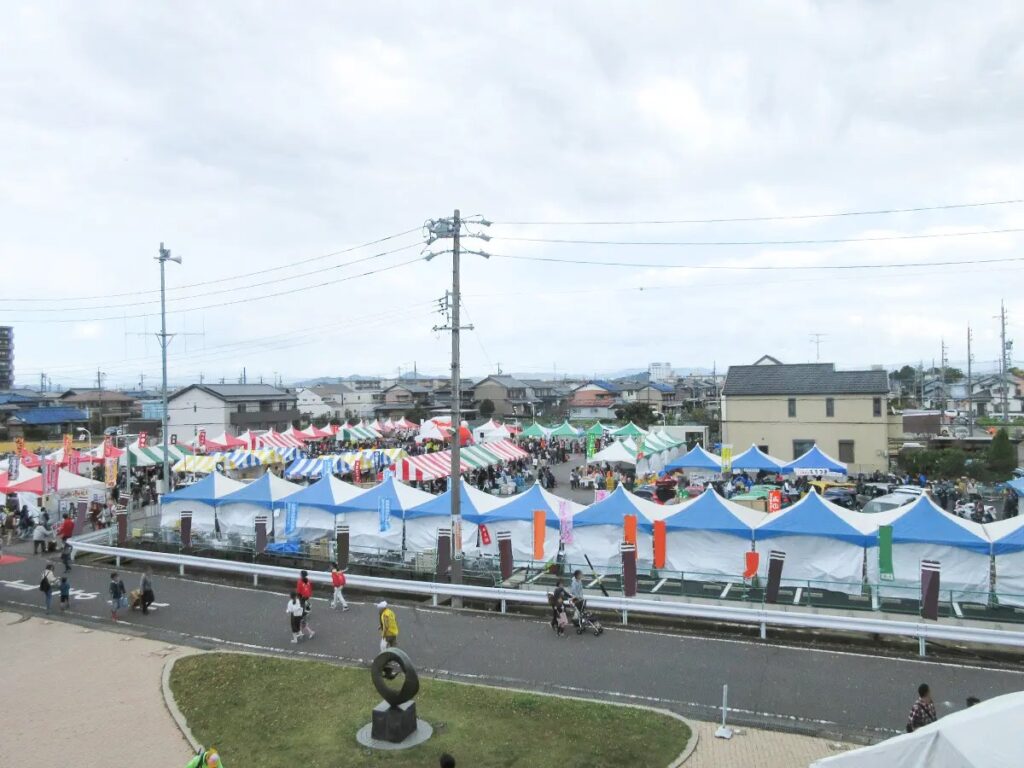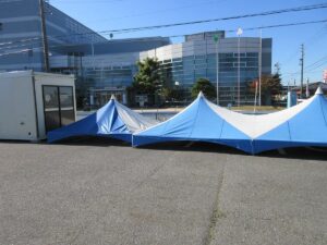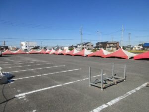 市民文化祭ではトラスゲートを使用して看板の取り付けを行い、入場ゲートとして設営を行いました。また広い駐車場を用いて色とりどりの模擬店用テントを組み立てています。